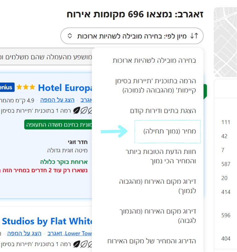 כשאתם ניגשים לחפש מקום לינה ביעד אליו אתם נוסעים פשוט הקליקו על הלינק הזה. הקישו בחלון החיפוש את היעד שלכם ואת התאריכים הרצויים לכם. אחרי שתקבלו את התוצאות, הקליקו על “sort by” (= “מיון לפי” בעברית). ובחרו : מחיר. ואז בוקינג יסנן לכם את התוצאות לפי המחיר מהזול ביותר ליקר ביותר. השתמשו גם במסננים אחרים כדי לחסוף לעצמכם זמן…