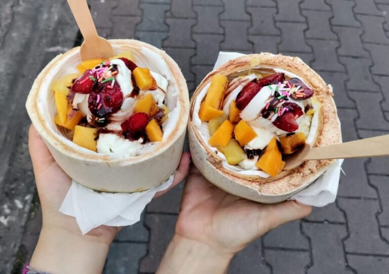 🧃 שייק קוקוס קר בשקית – נמכר בפינות רחוב, מגיע עם קש במבוק וקרח גרוס, לפעמים עם עיטור מנגו למעלה. מתוק, מרענן, שקט בנשמה.